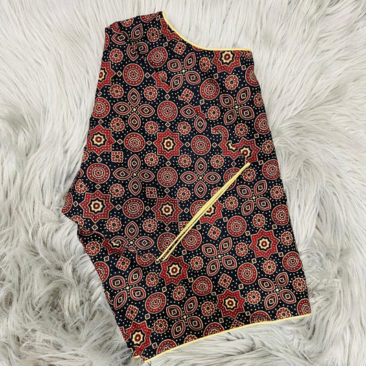 Black &Brown Geometric Printed Cotton Saree Blouse