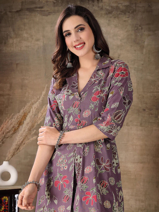 Purple & White Floral Printed Rayon Co-Ord Set