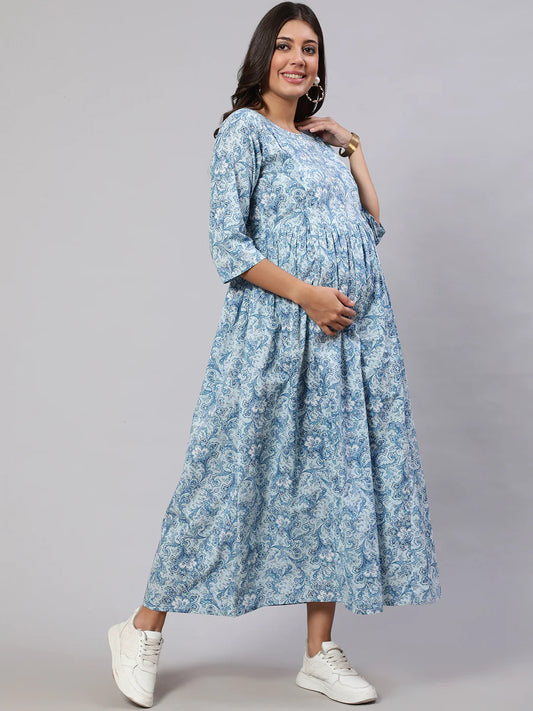 Light Blue printed Cotton Maternity Dress