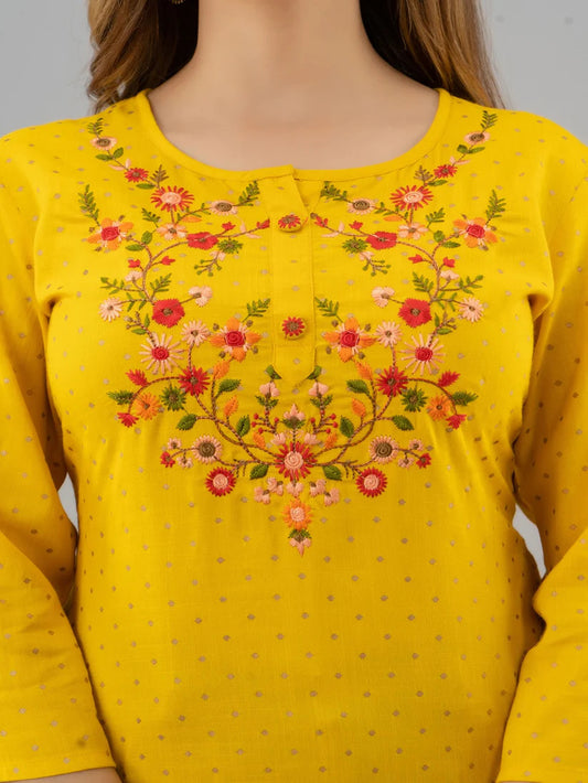 Mustard Yellow Yoke embroidered Rayon short kurti Top