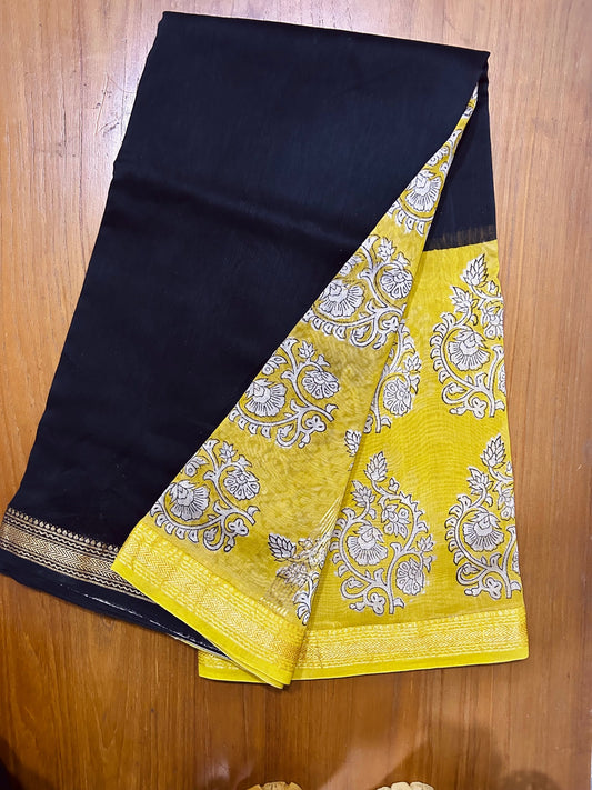 Black & Yellow Hand Block Printed Pure Maheswari Silk Saree