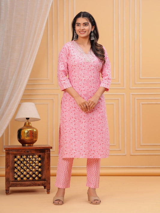 Pink & White Block Printed Cotton Kurti With Pants
