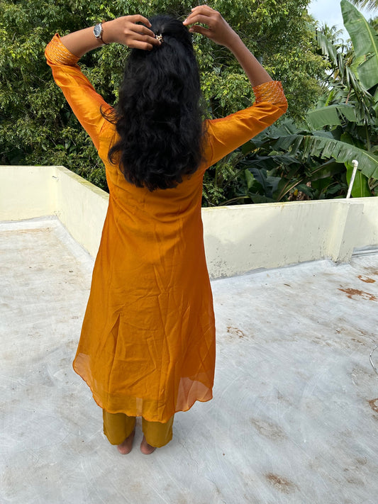 Mustard embroidered Organza Kurti Palazzo with Dupatta