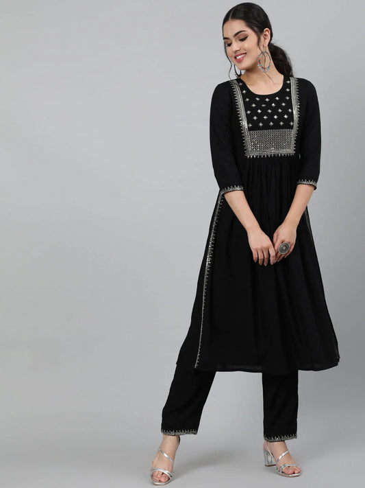 Solid Black Rayon Naira Cut Kurti With Pants Set