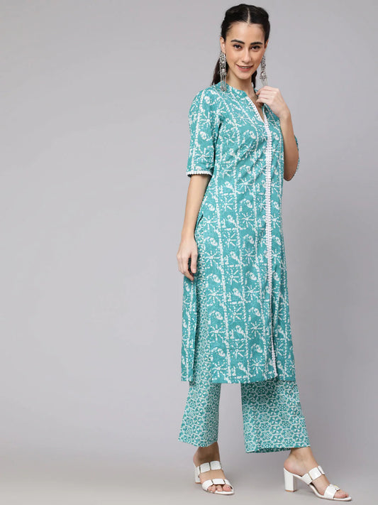 Turquoise Green Cotton Kurta Palazzo Set With Dupatta