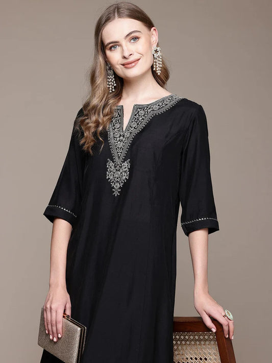 Black Silver Zari Embroidered Silk Kurti With Pants Set